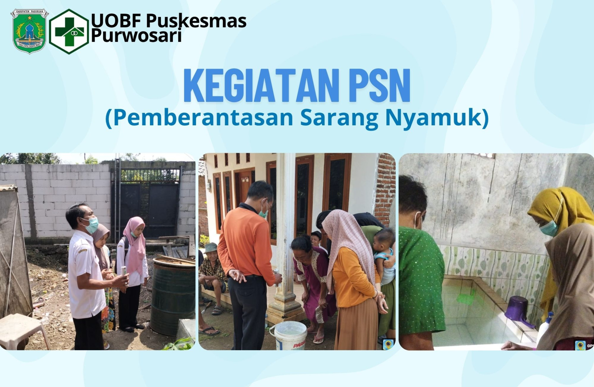Kegiatan PSN kali ini diikuti petugas DBD dan Kader Jumantik (Juru Pemantau Jentik). Kegiatan PSN dilakukan dengan pemantauan jentik di semua tandon air yang ada di dalam maupun diluar rumah. Tandon air meliputi (bak mandi, bak penampung air, ember, gentong, dispenser, kulkas, vas bunga, tempat makan burung, ban bekas, kaleng bekas, botol bekas, batok kelapa, pagar bambu/besi, talang air dan semua tempat yang memungkinkan untuk terisi air saat hujan. Pemantauan jentik dilakukan dengan menggunakan senter karena jentik nyamuk Aedes akan bergerak bila menerima sinar.
